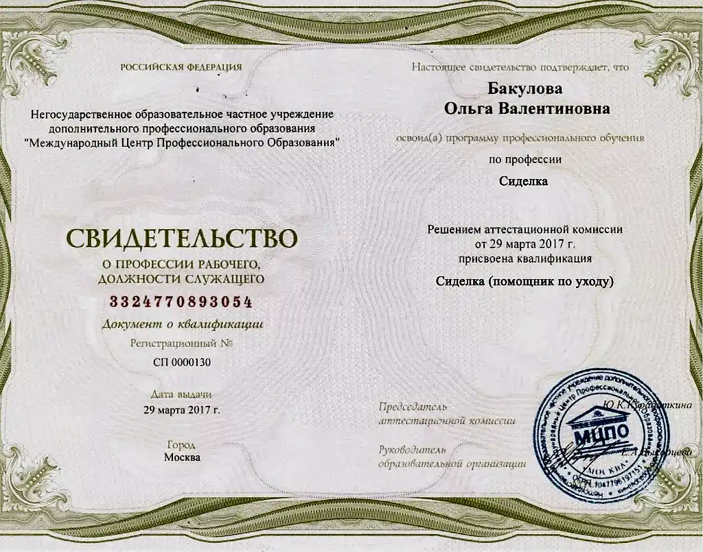 | Документ об образовании | свидетельство гос. образца |